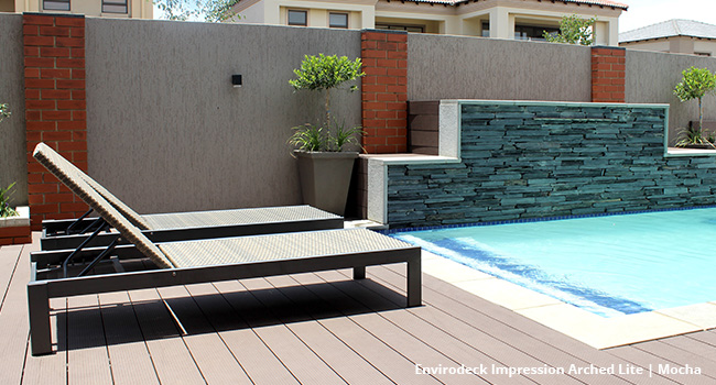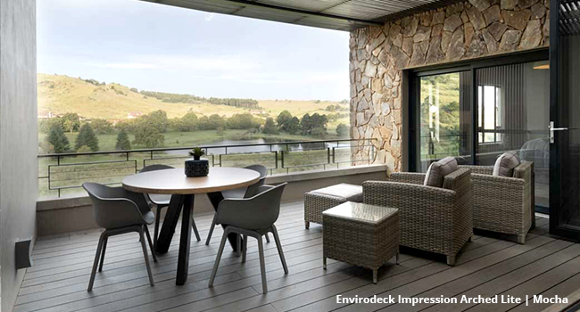 The Envirodeck Impression Arched Lite Profile is the more economical option in the Envirodeck range, maintaining the same strength and stability without compromising quality. Available in two distinct finishes: ribbed square (modern) or wood grain embossed (natural). Made from 95% recycled materials with UV, mould, and moisture resistance. Easy clip installation system. Dimensions: 146 x 23mm | Standard Length: 5.85m | Weight per board: 20kg | Joist spacing: 300mm CTC | 1.14 boards per m². Available in 4 colours: Etosha, Moremi, Mocha, Lava. Fire rating: Class C. 10-year manufacturer warranty. Proudly supplied by On The Deck — South Africa’s leading composite decking specialists.