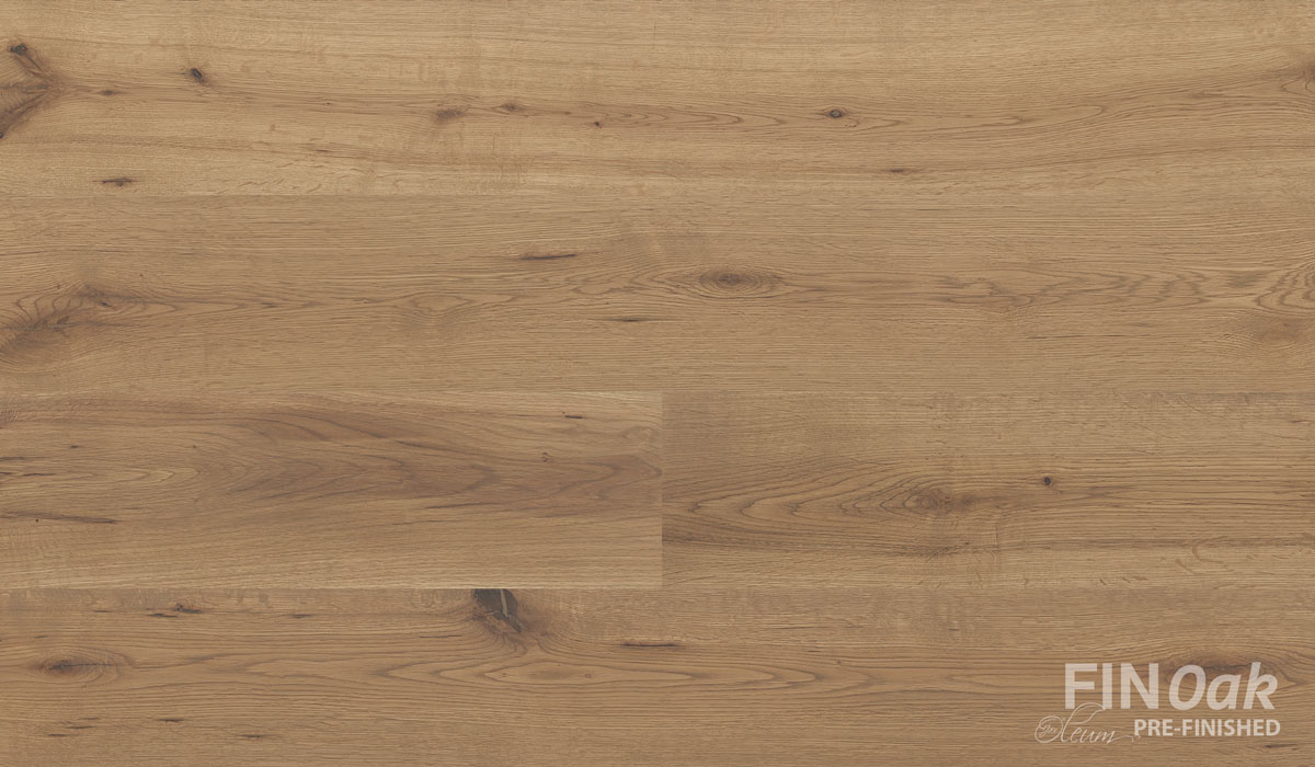 FINoak Oleum Pre-finished Sand is a 190mm wide, 14/3mm engineered oak floor finished with Rubio Monocoat natural oil in a warm sandy tone. Features a 3mm lightly brushed rustic-grade oak top face, multi-ply core, and licensed Unilin drop-down click system. Oil finish allows spot repair and re-oiling. FSC certified. 25-year limited residential warranty.